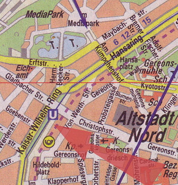 Mit dem Auto von auswärts kommend erreicht man uns über die A57 . Diese durch die Unterführung bis zum Ende durchfahren, Richtung Innenstadt halbrechts auf die Herkulesstraße. Direkt hinter der nächsten Unterführung nicht der eigentlichen Straßenführung folgen, sondern exakt geradeaus auf die Gladbacherstraße. Schon nach ca. 100 m erreicht man die Ecke Kaiser-Wilhelm-Ring und ist am Ziel. Recht gute Parkmöglichkeiten gibt es in den anliegenden Nebenstraßen oder im Parkhaus Kaiser-Wilhelm-Ring, Einfahrt vom Friesenplatz kommend.